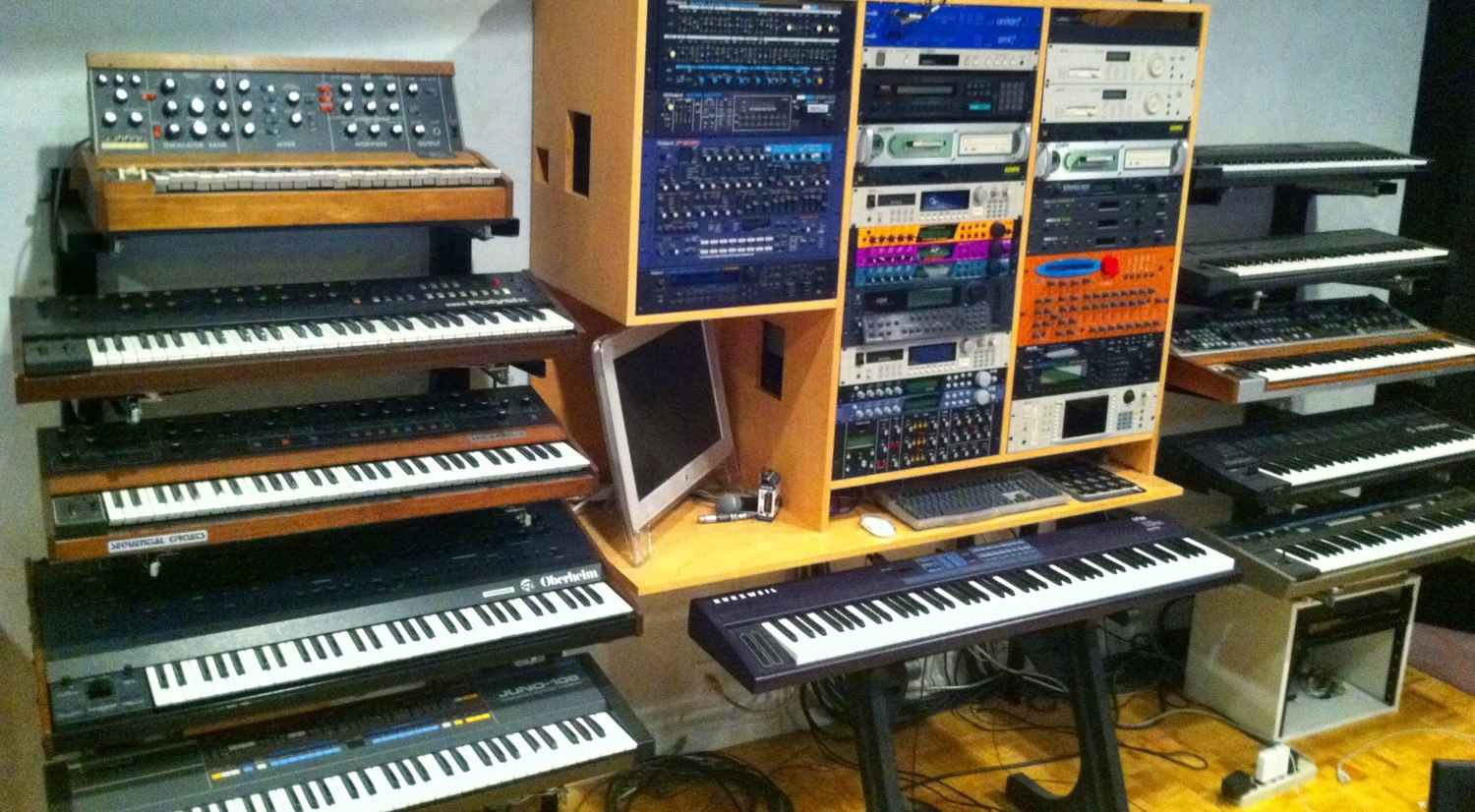 More self-indulgence, here's my synth wall. This is a really old picture, but the stuff is the same, although arranged a little differently now. And we put in new floors a couple years ago.